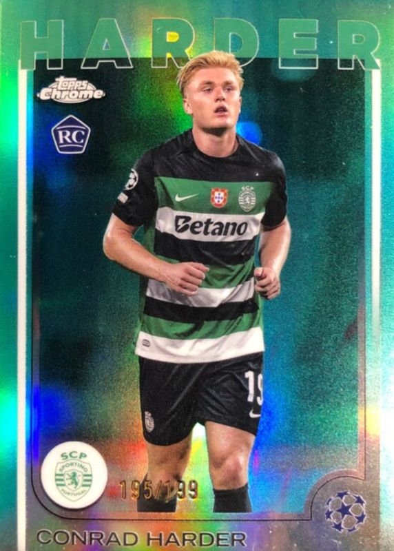 This card is 1 of 44 Conrad Harder's card variations in the 2024 Topps Chrome UEFA Club Competitions set being tracked by Sports Card Investor, including Base, Geometric Refractor, Hongbao Red Refractor, Magenta Shimmer Refractor, and Pulsar Refractor.