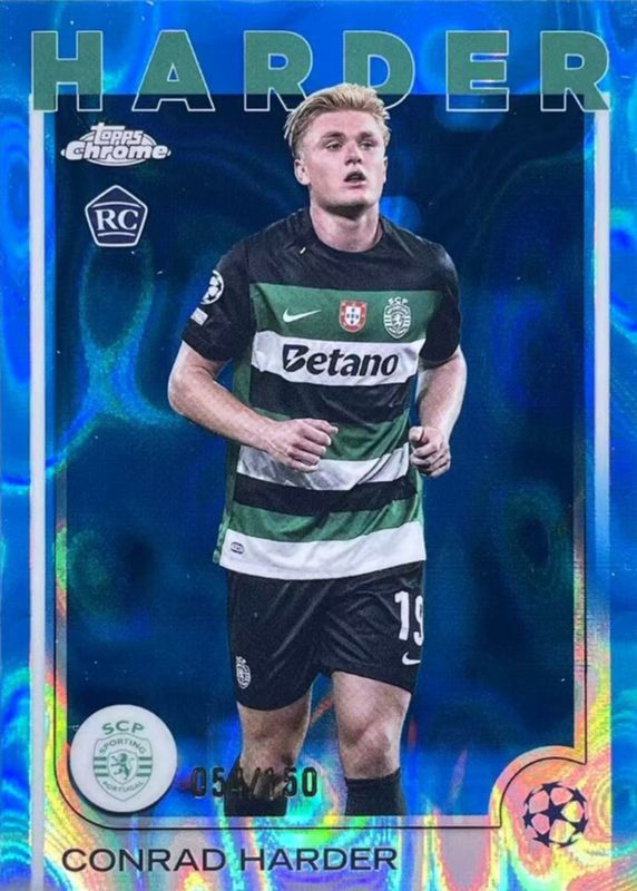 This card is 1 of 44 Conrad Harder's card variations in the 2024 Topps Chrome UEFA Club Competitions set being tracked by Sports Card Investor, including Base, Geometric Refractor, Hongbao Red Refractor, Magenta Shimmer Refractor, and Pulsar Refractor.