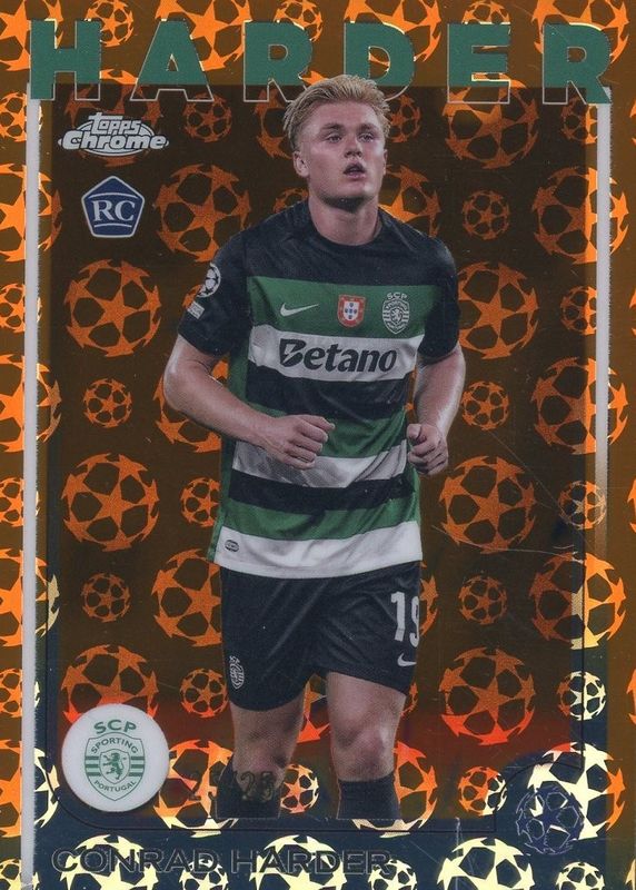 This card is 1 of 44 Conrad Harder's card variations in the 2024 Topps Chrome UEFA Club Competitions set being tracked by Sports Card Investor, including Base, Geometric Refractor, Hongbao Red Refractor, Magenta Shimmer Refractor, and Pulsar Refractor.