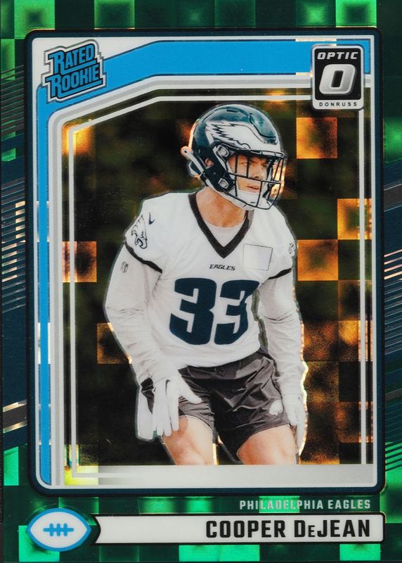 The Cooper DeJean 2024 Donruss #305 Optic Preview - Green Pandora /25 Rookie card in Raw condition has not changed in price in the last 30 days and was last sold for $229.95 .