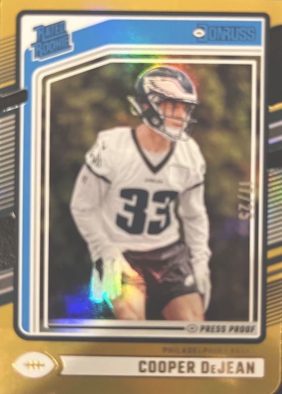The Cooper DeJean 2024 Donruss #305 Press Proof Gold Die-Cut /25 Rookie card in Raw condition has not changed in price in the last 30 days and was last sold for $159.99 .