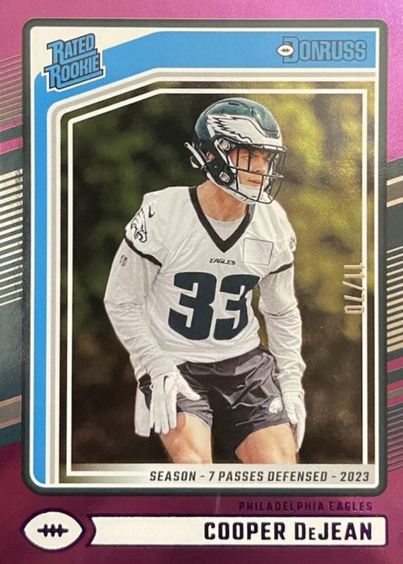 The Cooper DeJean 2024 Donruss #305 Season Stat Line (/70) Rookie card in Raw condition has not changed in price in the last 30 days and was last sold for $9.12 .