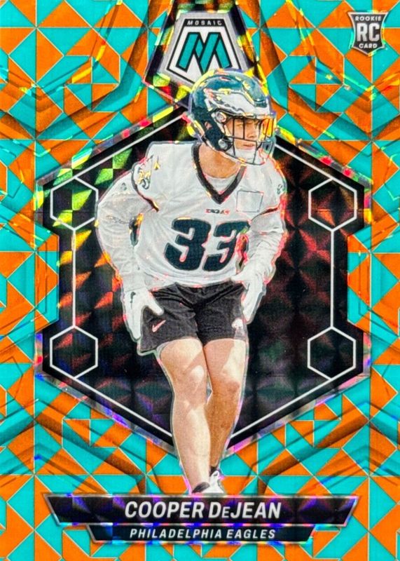 The Cooper DeJean 2024 Mosaic #340 Tessellation /15 Rookie card in Raw condition has not changed in price in the last 30 days and was last sold for $210.50 .