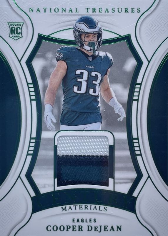 The Cooper DeJean 2024 National Treasures #CM-CDN Century Materials - Emerald /5 Rookie card in Raw condition has not changed in price in the last 30 days and was last sold for $54.00 .