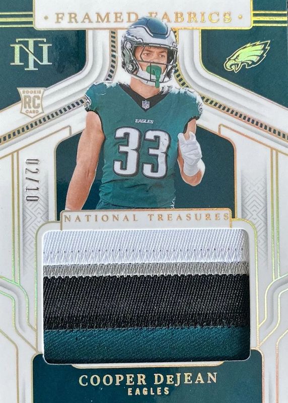 The Cooper DeJean 2024 National Treasures #FF-CDN Framed Fabric - Holo Gold /10 Rookie card in Raw condition has not changed in price in the last 30 days and was last sold for $71.00 .