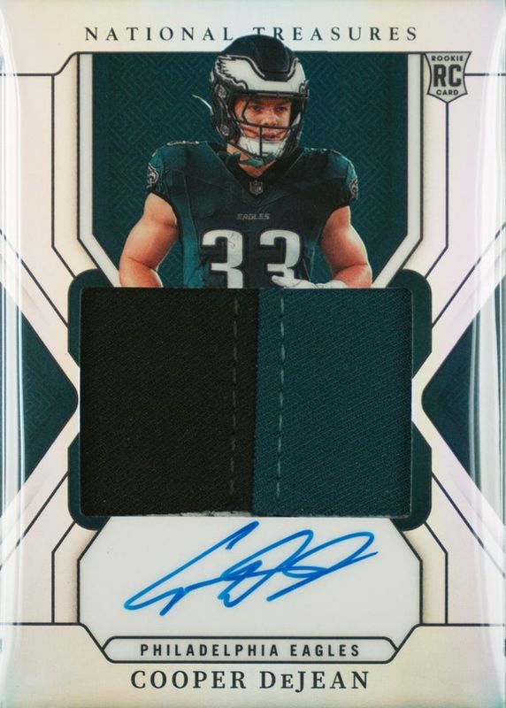 This card is 1 of 44 Cooper DeJean's card variations in the 2024 National Treasures set being tracked by Sports Card Investor, including Rookie Dual Materials - Red Jersey Number (/33), Rookie Patch Auto - Green Jersey Number (/33), Century Materials /99, Rookie Dual Materials /99, and Rookie Patch Auto /99.