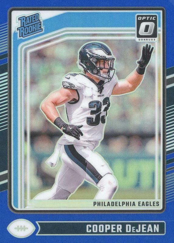 The Cooper DeJean 2024 Optic #221 Blue /199 Rookie card in Raw condition has moved up $5.26 (+235%) in the last 30 days and was last sold for $7.50 .