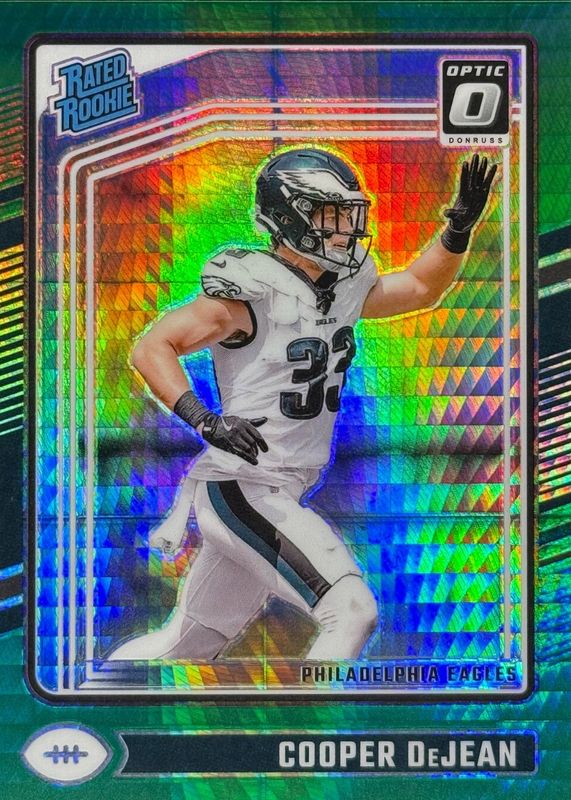 The Cooper DeJean 2024 Optic #221 Green Hyper Rookie card in Raw condition has moved up $0.59 (+7.9%) in the last 30 days and was last sold for $8.09 .