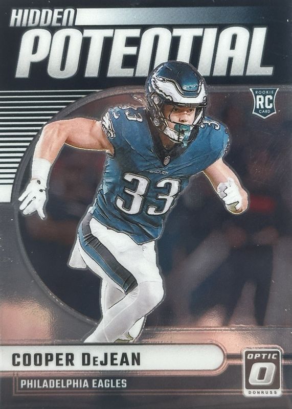 The Cooper DeJean 2024 Optic #11 Hidden Potential Rookie card in Raw condition has moved up $0.20 (+20.2%) in the last 30 days and was last sold for $1.19 .