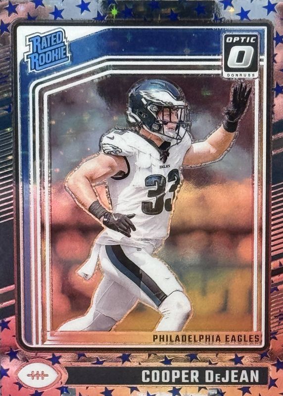 The Cooper DeJean 2024 Optic #221 Stars /(SSP) Rookie card in Raw condition has moved down -$0.50 (-6.3%) in the last 30 days and was last sold for $7.50 .