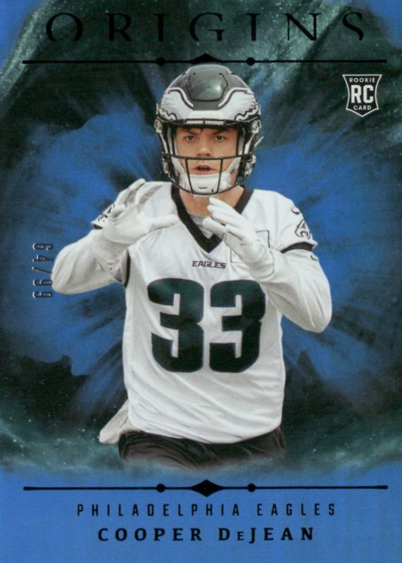 This card is 1 of 19 Cooper DeJean's card variations in the 2024 Origins set being tracked by Sports Card Investor, including Base, Holo Red /299, Holo Orange /149, Red /149, and Orange /125.