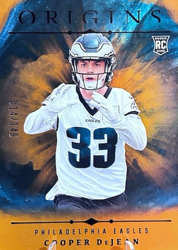 This card is 1 of 19 Cooper DeJean's card variations in the 2024 Origins set being tracked by Sports Card Investor, including Base, Holo Red /299, Red /149, Orange /125, and Blue /99.