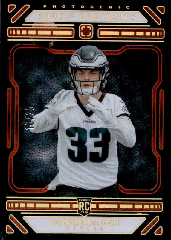 The Cooper DeJean 2024 Photogenic #188 Rookie Portraits - Orange /25 card in Raw condition has not changed in price in the last 30 days and was last sold for $26.00 .