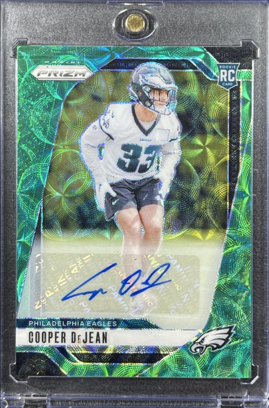 The Cooper DeJean 2024 Prizm #321 Base Autographs - Green Scope /75 Rookie card is 1 of 114 Cooper DeJean's card variations in the 2024 Prizm set being tracked by Sports Card Investor, including Base, Choice Blue Yellow Green, Choice Silver, Disco, and Green.