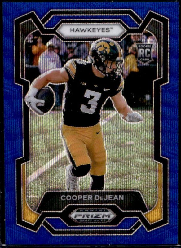 The Cooper DeJean 2024 Prizm Draft Picks #113 Autographs - Blue Wave /249 Rookie card is 1 of 139 Cooper DeJean's card variations in the 2024 Prizm Draft Picks set being tracked by Sports Card Investor, including Base, Green, Purple Wave, Red Ice, and Ruby Wave.