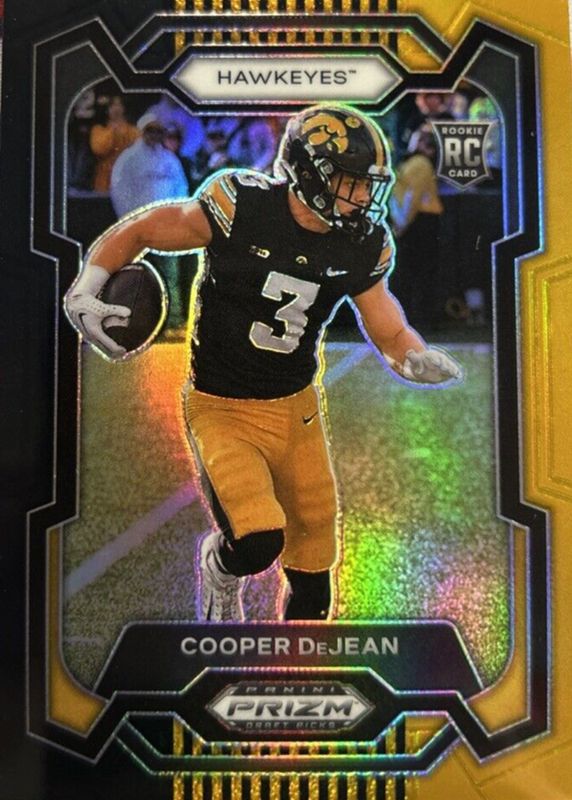 The Cooper DeJean 2024 Prizm Draft Picks #113 Black & Gold /5 Rookie card in Raw condition has not changed in price in the last 30 days and was last sold for $200.00 .