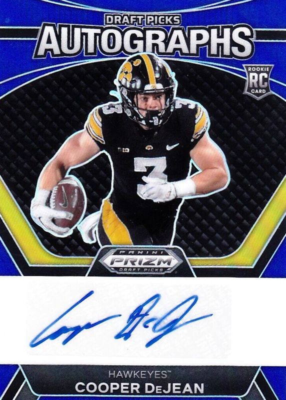 The Cooper DeJean 2024 Prizm Draft Picks #DPA-CDN Draft Picks Autographs - Blue /149 Rookie card in Raw condition has not changed in price in the last 30 days and was last sold for $23.05 .