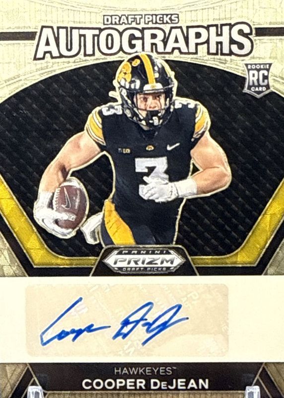 The Cooper DeJean 2024 Prizm Draft Picks #DPA-CDN Draft Picks Autographs - Gold Vinyl /1 Rookie card in Raw condition has not changed in price in the last 30 days and was last sold for $723.00 .