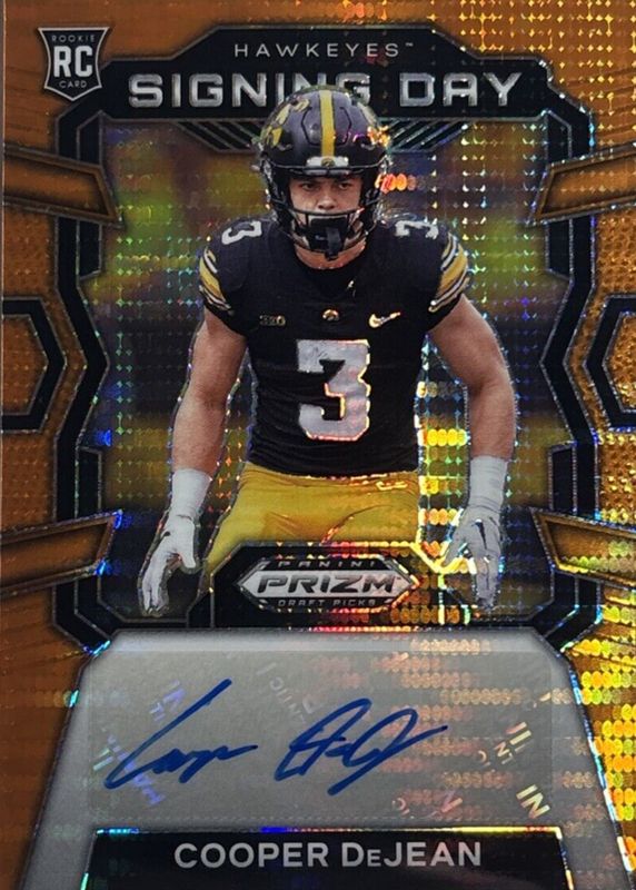 The Cooper DeJean 2024 Prizm Draft Picks #DPA-CDN Draft Picks Autographs - Orange Pulsar /49 Rookie card in Raw condition has not changed in price in the last 30 days and was last sold for $70.00 .