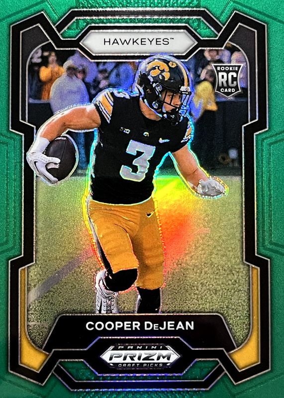 The Cooper DeJean 2024 Prizm Draft Picks #113 Green Rookie card in Raw condition has moved down -$3.05 (-50.8%) in the last 30 days and was last sold for $2.95 .