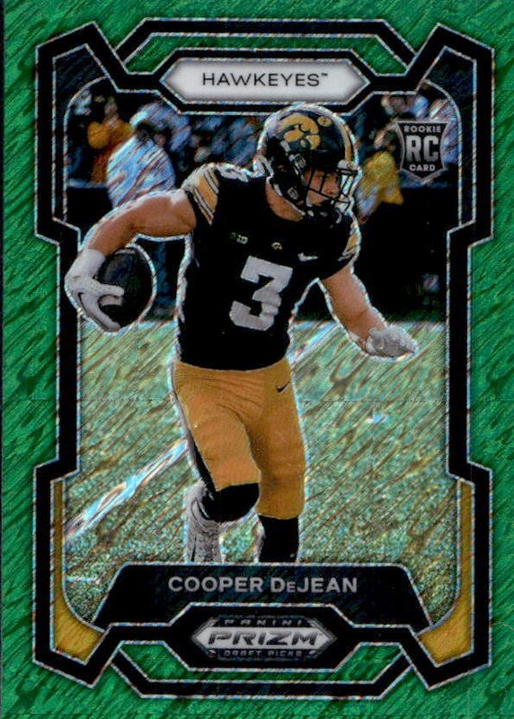 The Cooper DeJean 2024 Prizm Draft Picks #113 Green Shimmer /8 Rookie card in Raw condition has not changed in price in the last 30 days and was last sold for $78.00 .