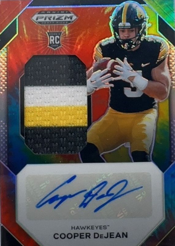 The Cooper DeJean 2024 Prizm Draft Picks #JPA-CDN Jumbo Rookie Patch Autographs - Tie-Dye /25 card in Raw condition has not changed in price in the last 30 days and was last sold for $199.99 .
