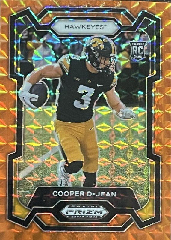 The Cooper DeJean 2024 Prizm Draft Picks #113 Orange Finite /39 Rookie card in Raw condition has not changed in price in the last 30 days and was last sold for $45.00 .