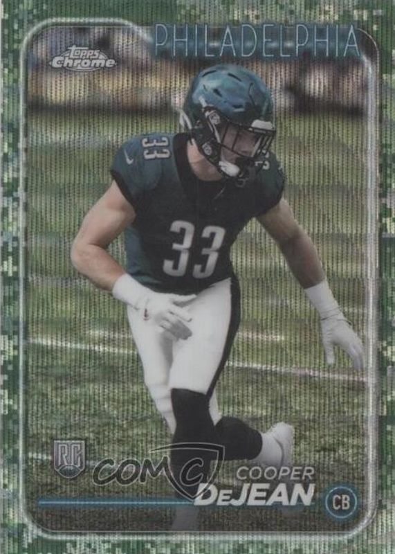The Cooper DeJean 2024 Topps Chrome #232 Camo Wave Refractor Rookie card in Raw condition has not changed in price in the last 30 days and was last sold for $29.77 .