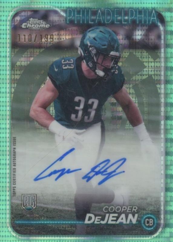 The Cooper DeJean 2024 Topps Chrome #RA-CDE Rookie Auto - Aqua Sonar Refractor /199 card in Raw condition has moved down -$14.71 (-34.2%) in the last 30 days and was last sold for $28.33 .