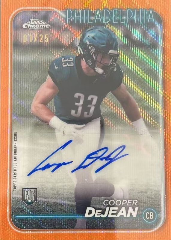 Auctions Ending Soon for Cooper DeJean 2024 Topps Chrome #RA-CDE Rookie Auto - Orange Wave Refractor /25 RAW