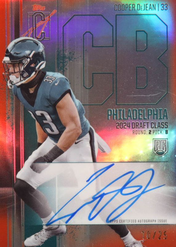The Cooper DeJean 2024 Topps Signature Class #RCV-CDE Rookie Chrome Autographs - Red Refractor /25 card in Raw condition has not changed in price in the last 30 days and was last sold for $99.51 .