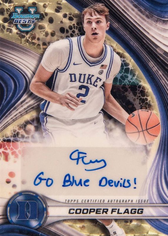 This card is 1 of 36 Cooper Flagg's card variations in the 2024 Bowman Best University set being tracked by Sports Card Investor, including Base, Geometric Refractor, Refractor, Shimmer Refractor, and Purple Refractor /250.