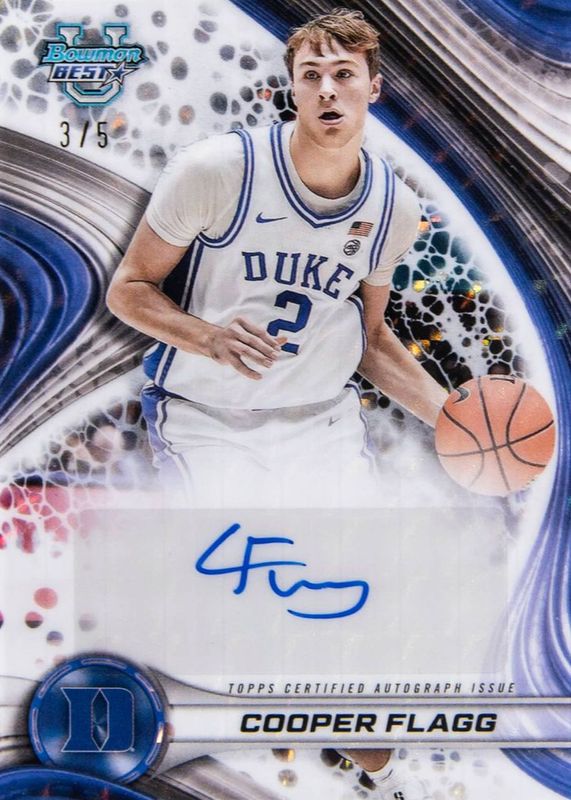 The Cooper Flagg 2024 Bowman Best University #B24-CF Best of 2024 Autographs - White Geometric Refractor /5 card in Raw condition has not changed in price in the last 30 days.