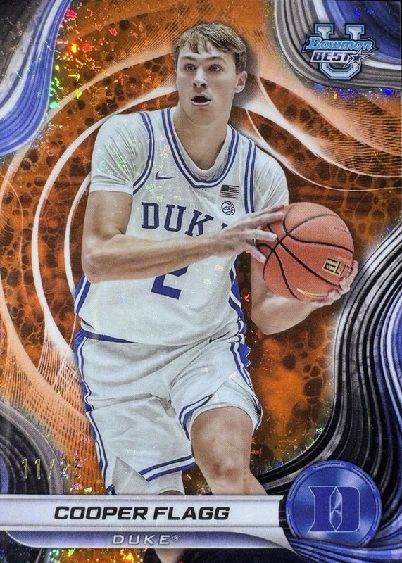 This card is 1 of 36 Cooper Flagg's card variations in the 2024 Bowman Best University set being tracked by Sports Card Investor, including Base, Geometric Refractor, Refractor, Shimmer Refractor, and Purple Refractor /250.