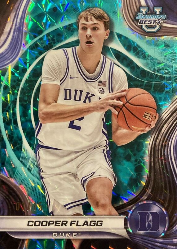 This card is 1 of 36 Cooper Flagg's card variations in the 2024 Bowman Best University set being tracked by Sports Card Investor, including Base, Geometric Refractor, Refractor, Shimmer Refractor, and Purple Refractor /250.
