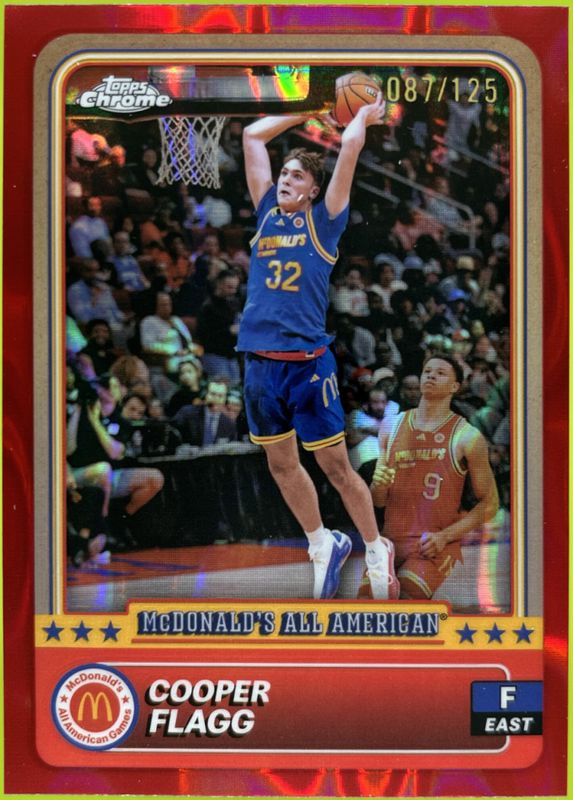 The Cooper Flagg 2024 Topps Chrome McDonald's All-American #28 Red Lava Refractor /125 card is 1 of 112 Cooper Flagg's card variations in the 2024 Topps Chrome McDonald's All-American set being tracked by Sports Card Investor, including #78 Base, #28 Base, #28 Blue RayWave Refractor, #78 Blue RayWave Refractor, and #28 McDonald's Logo Refractor.