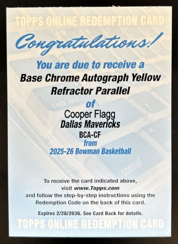 The Cooper Flagg 2025 Bowman #BCA-CF Chrome Autographs - Yellow Refractor /75 Rookie card is 1 of 197 Cooper Flagg's card variations in the 2025 Bowman set being tracked by Sports Card Investor, including Base, Chrome - Mojo Refractor, Chrome - Fuchsia Mojo Refractor /299, Chrome - Purple Mojo Refractor /250, and Chrome - Pink Mojo Refractor /199.