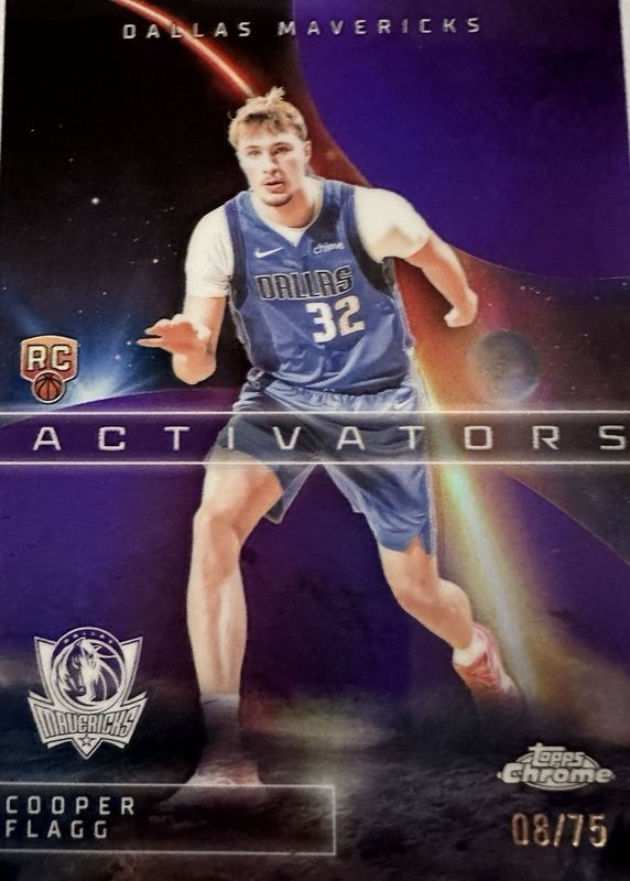 The Cooper Flagg 2025 Topps Chrome #AC-11 Activators - Purple Refractor /75 Rookie card in Raw condition has moved up $35.50 (+20.6%) in the last 30 days and was last sold for $208.00 .