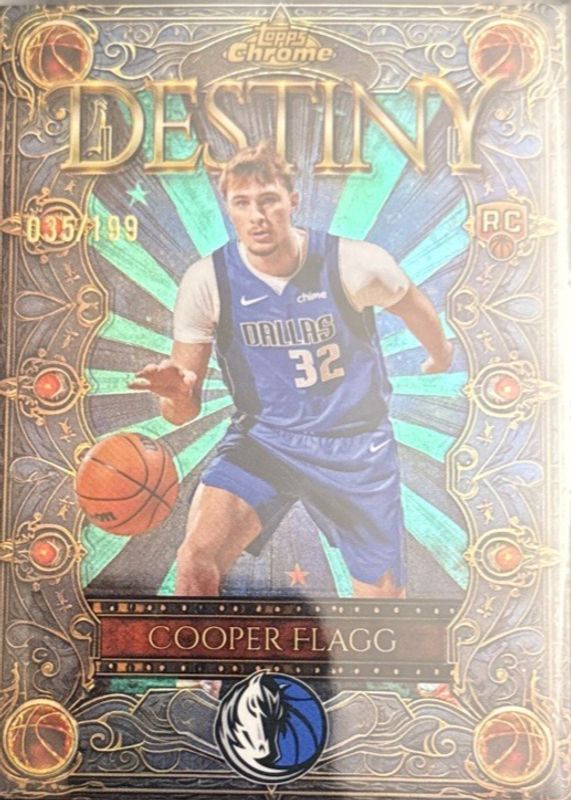 The Cooper Flagg 2025 Topps Chrome #D-1 Destiny - Aqua Refractor /199 Rookie card in Raw condition has not changed in price in the last 30 days and was last sold for $199.99 .