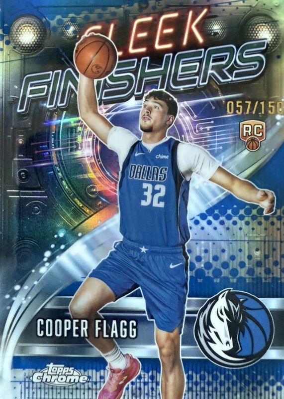 The Cooper Flagg 2025 Topps Chrome #SF-21 Sleek Finishers - Blue Refractor /150 Rookie card in Raw condition has moved down -$35.00 (-14.0%) in the last 30 days and was last sold for $215.00 .