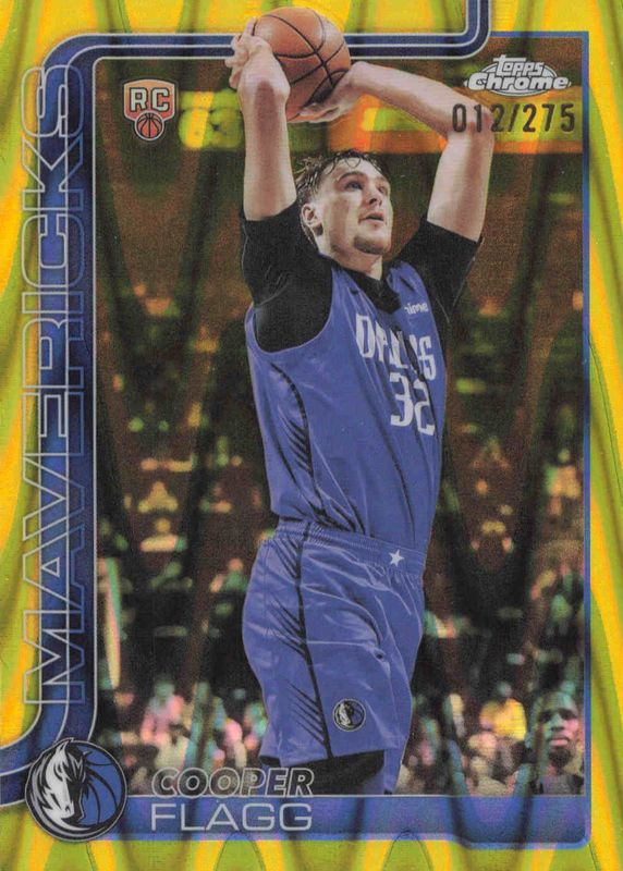The Cooper Flagg 2025 Topps Chrome #251 Yellow RayWave Refractor /275 Rookie card in Raw condition has moved down -$75.00 (-11.5%) in the last 30 days and was last sold for $575.00 .