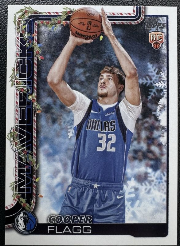 The Cooper Flagg 2025 Topps Holiday #SSB-CF Holiday Backs Variation Rookie card is 1 of 39 Cooper Flagg's card variations in the 2025 Topps Holiday set being tracked by Sports Card Investor, including Base, Blue Metallic Glitter, Glitter, Light Blue & White Glitter, and Plaid.