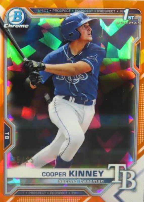 The biggest 30-day change Cooper Kinney cards are 2021 Bowman Draft Sapphire Edition #BDC-127 Chrome - Orange /25 (1st), 2021 Bowman Draft Sapphire Edition #BDC-127 Chrome - Purple /10 (1st), and 2021 Bowman Draft Sapphire Edition #BDC-127 Chrome (1st).