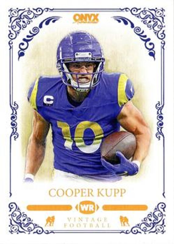 The Cooper Kupp 2022 Onyx Vintage #VFCK Base card is 1 of 5 Cooper Kupp's card variations in the 2022 Onyx Vintage set being tracked by Sports Card Investor, including Blue Signatures Autographs, Green Signatures Autographs /50, Red Signatures Autographs /25, and Black Signatures Autographs /5.