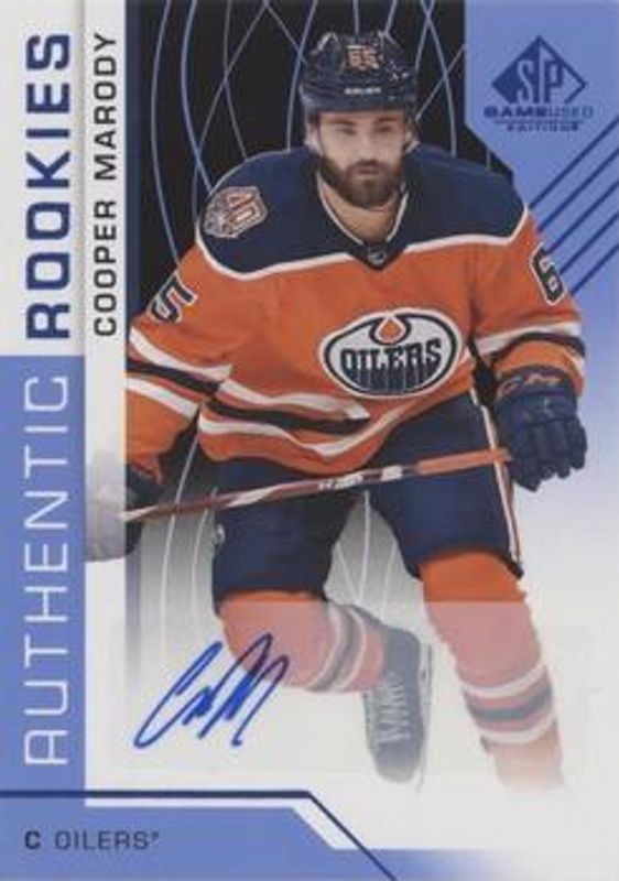 The Cooper Marody 2018 SP Game Used #171 Blue Autographs Rookie card is 1 of 7 Cooper Marody's card variations in the 2018 SP Game Used set being tracked by Sports Card Investor, including Base /26, Authentic Rookies Rainbow /200, Orange Rainbow /118, Authentic Rookies Snowstorm (Black) /5, and Green Storm /1.