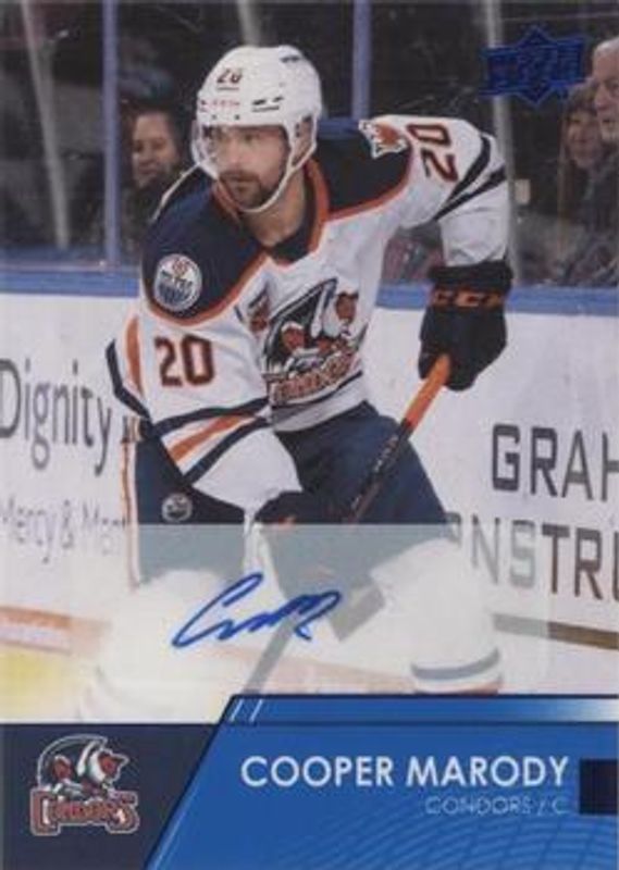 The Cooper Marody 2021 Upper Deck AHL #50 Autographs card is 1 of 13 Cooper Marody's card variations in the 2021 Upper Deck AHL set being tracked by Sports Card Investor, including Base, Exclusives /100, High Gloss /10, AHL All Stars, and AHL All Stars Autographs.