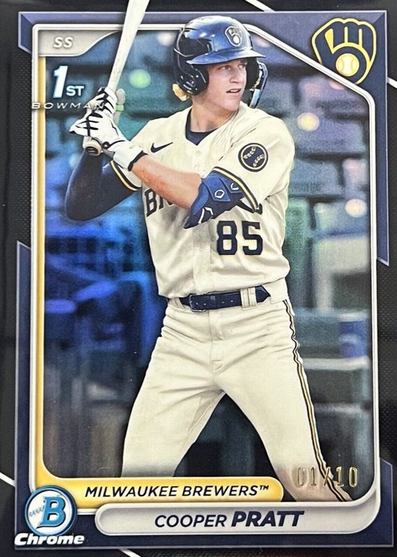 This card is 1 of 55 Cooper Pratt's card variations in the 2024 Bowman set being tracked by Sports Card Investor, including Chrome Prospects (1st), Chrome Prospects - Lunar Glow Refractor (1st), Chrome Prospects - Mini-Diamond Refractor (1st), Chrome Prospects - Pearl Refractor (1st), and Chrome Prospects - Refractor /499 (1st).