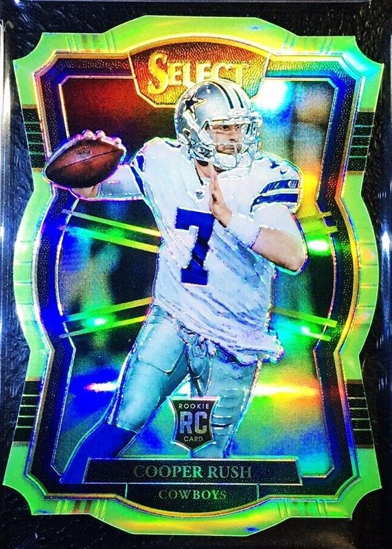 The Cooper Rush 2017 Select #152 Premier Level Neon Green Die-Cut /49 Rookie card in Raw condition has not changed in price in the last 30 days and was last sold for $10.70 .