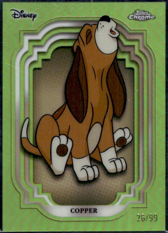 The Copper 2024 Topps Chrome Disney #41 Green Refractor /99 card is 1 of 15 Copper's card variations in the 2024 Topps Chrome Disney set being tracked by Sports Card Investor, including Base, Refractor, Purple Refractor /199, Purple & Green Pulsar /150, and Black & White Speckle /101.