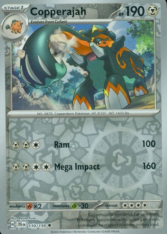 The Copperajah 2025 Scarlet & Violet: Journey Together #110/159 Reverse Holo card in Raw TCG (Lightly Played) condition has not changed in price in the last 30 days and was last sold for $0.99 .